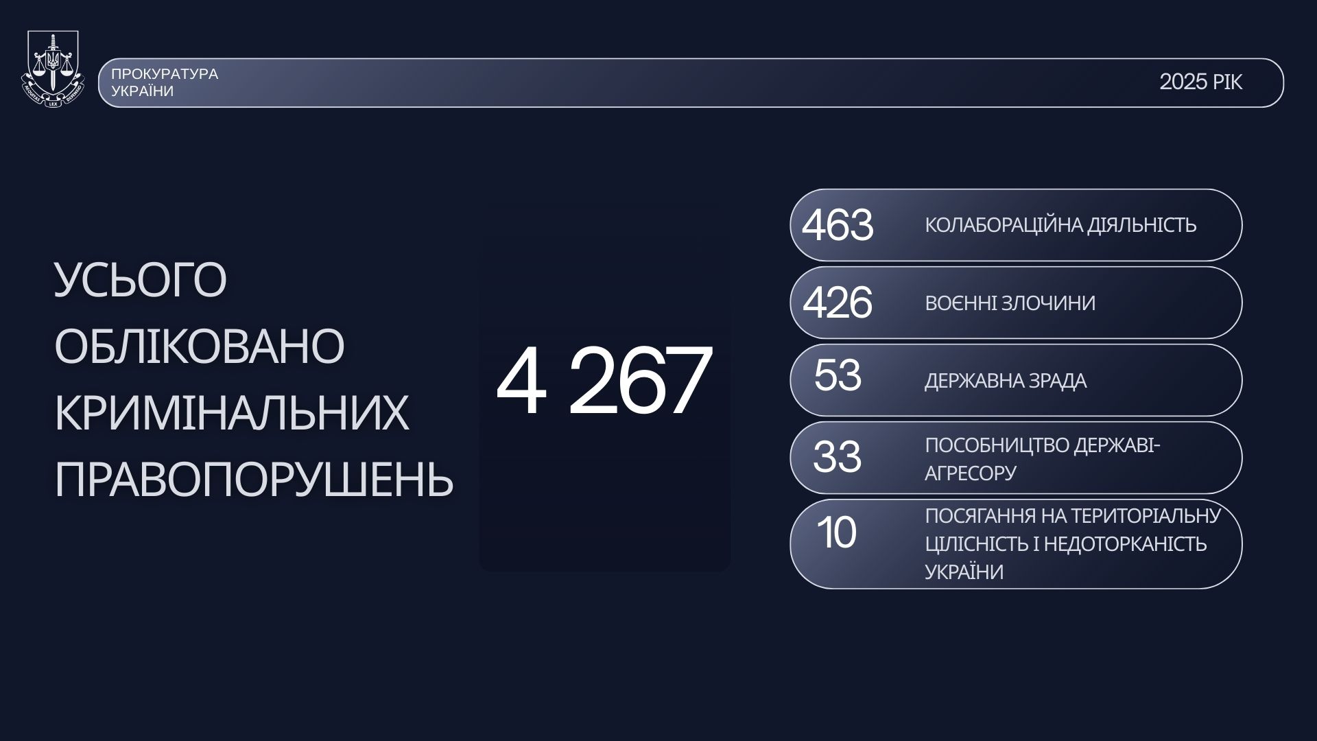 Усього обліковано кримінальних порушень – 4 267. З них 463 – колабораційна діяльність, 426 – воєнні злочини, 53 – державна зрада, 33 – пособництво державі-агресорці, 10 посягання на територіальну цілісність і недоторканість України.