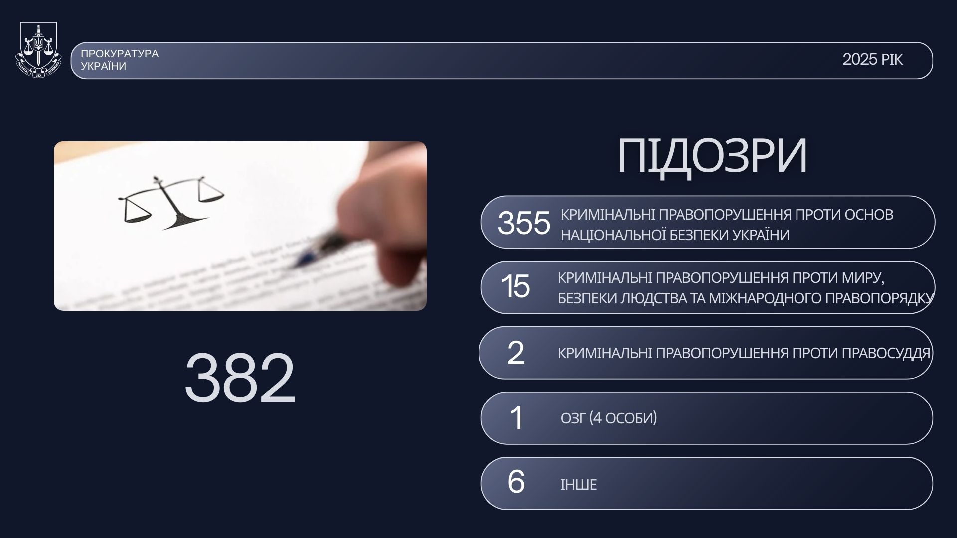 Оголошено 382 підозри: 355 – кримінальні правопорушення проти основ національної безпеки України, 15 - кримінальні правопорушення проти миру, безпеки людства та міжнародного правопорядку, 2 - кримінальні правопорушення проти правосуддя, 1 – ОЗГ (4 особи), 6 – інше.