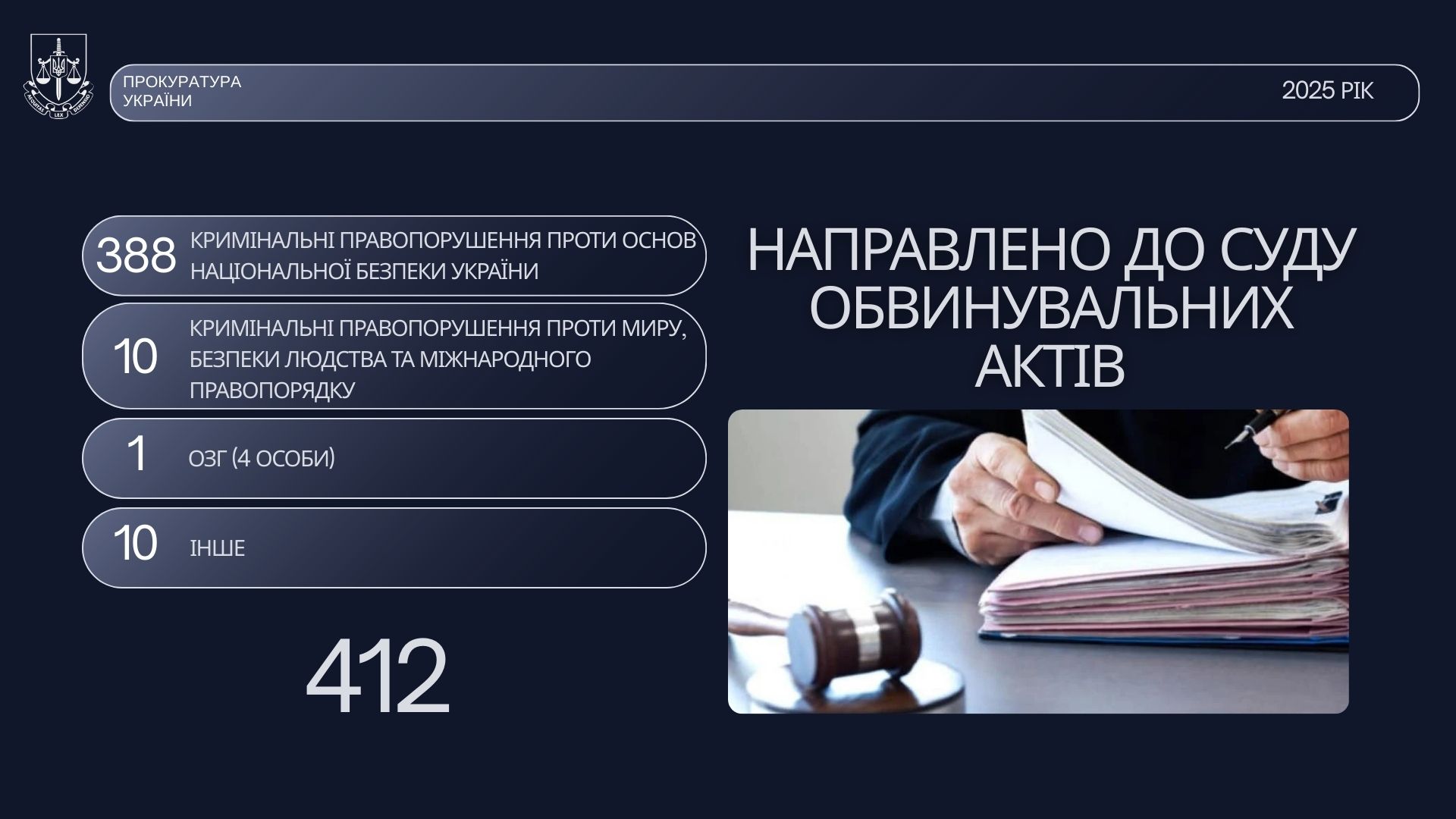 До суду направлено 412 обвинувальних актів. 388 – проти основ національної безпеки України, 10 - кримінальні правопорушення проти миру, безпеки людства та міжнародного правопорядку, 1 – ОЗГ (4 особи), 10 – інше.