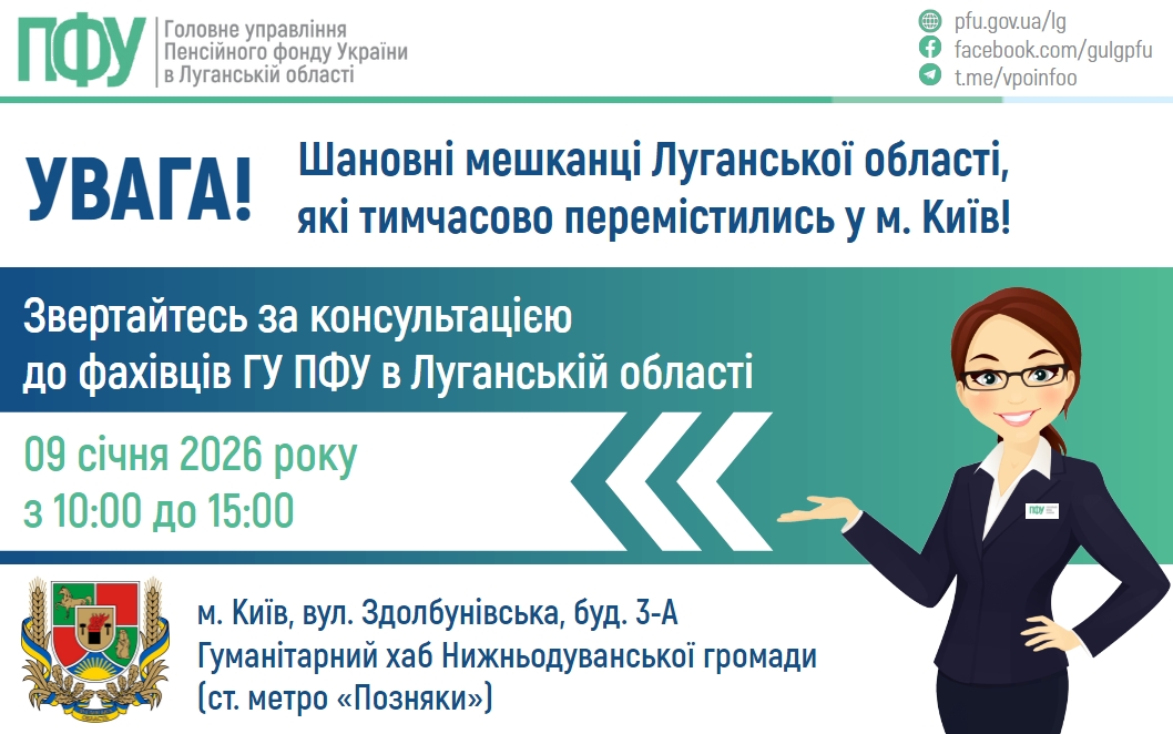 9 січня 2026 року спеціалісти Пенсійного фонду проведуть прийом внутрішньо переміщених осіб з Луганської області, які тимчасово мешкають у Києві.