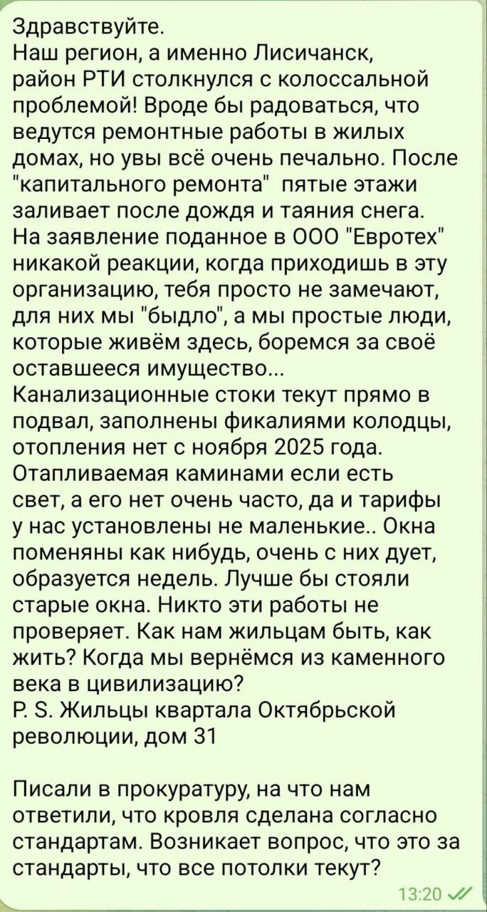 “Наш регіон, а саме Лисичанськ, район ГТВ стикнувся з колосальною проблемою! Начебто радіти, що ведуться ремонтні роботи у житлових будинках, але, на жаль, все сумно”, - наголошують мешканці будинку № 31 у кв. Східний (Жовтневої революції).