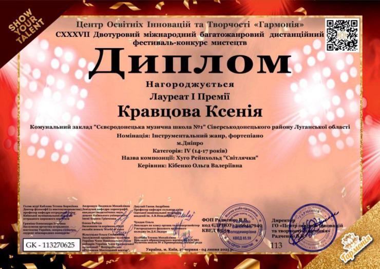 – Так, діти й викладачі активно беруть участь у всеукраїнських і міжнародних конкурсах. Лауреатами перших премій за минулий рік стали, зокрема, Поліна Тітченко, Ксенія Кравцова, Марія Назаренко, Єлизавета Чумакова, Станіслава Ратушенко, Вікторія Бердецька. Є також другі й треті місця на міжнародних фестивалях у Києві та Одесі.