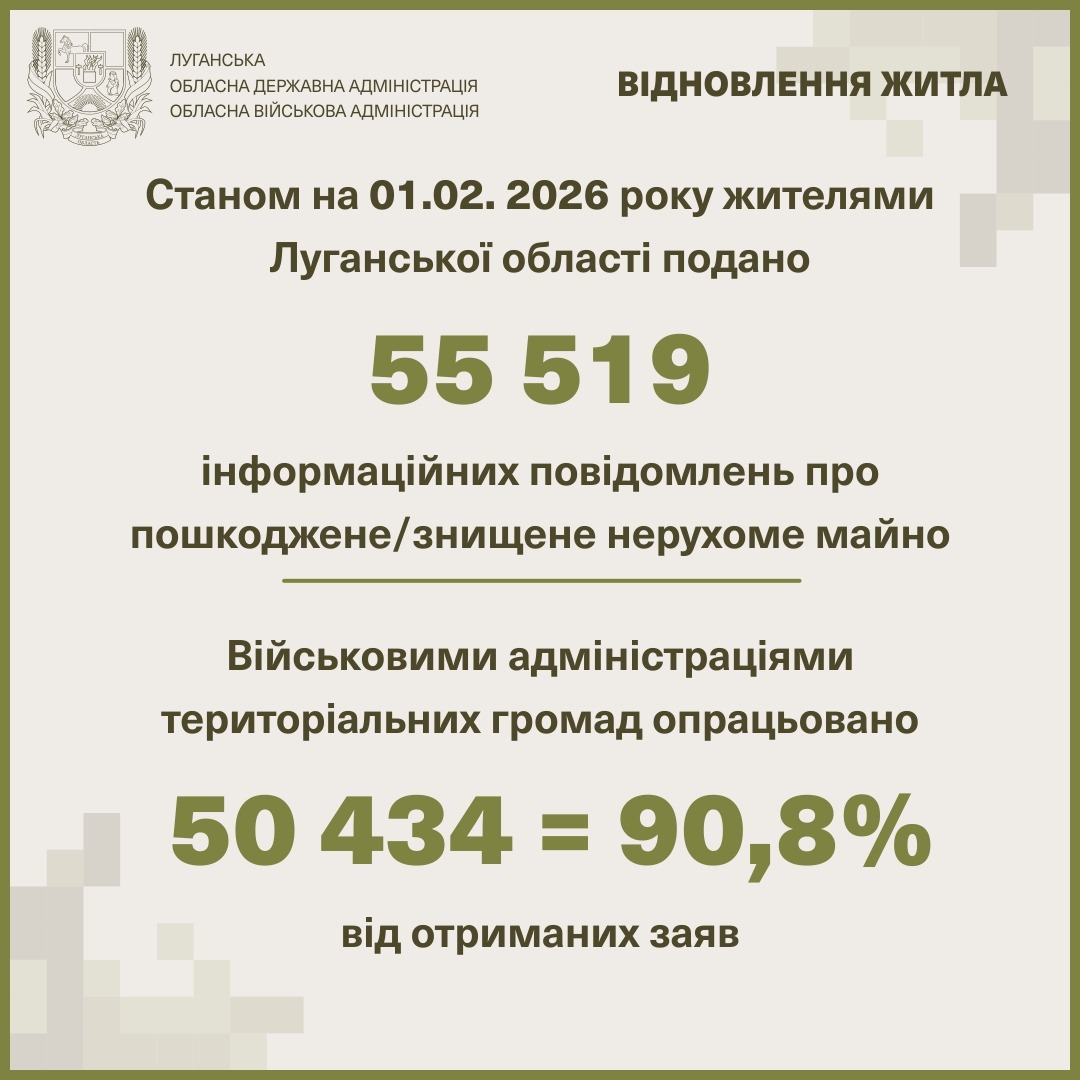 Наразі жителі Луганської області подали 55 519 інформаційних повідомлень про пошкоджене/знищене нерухоме майно.
