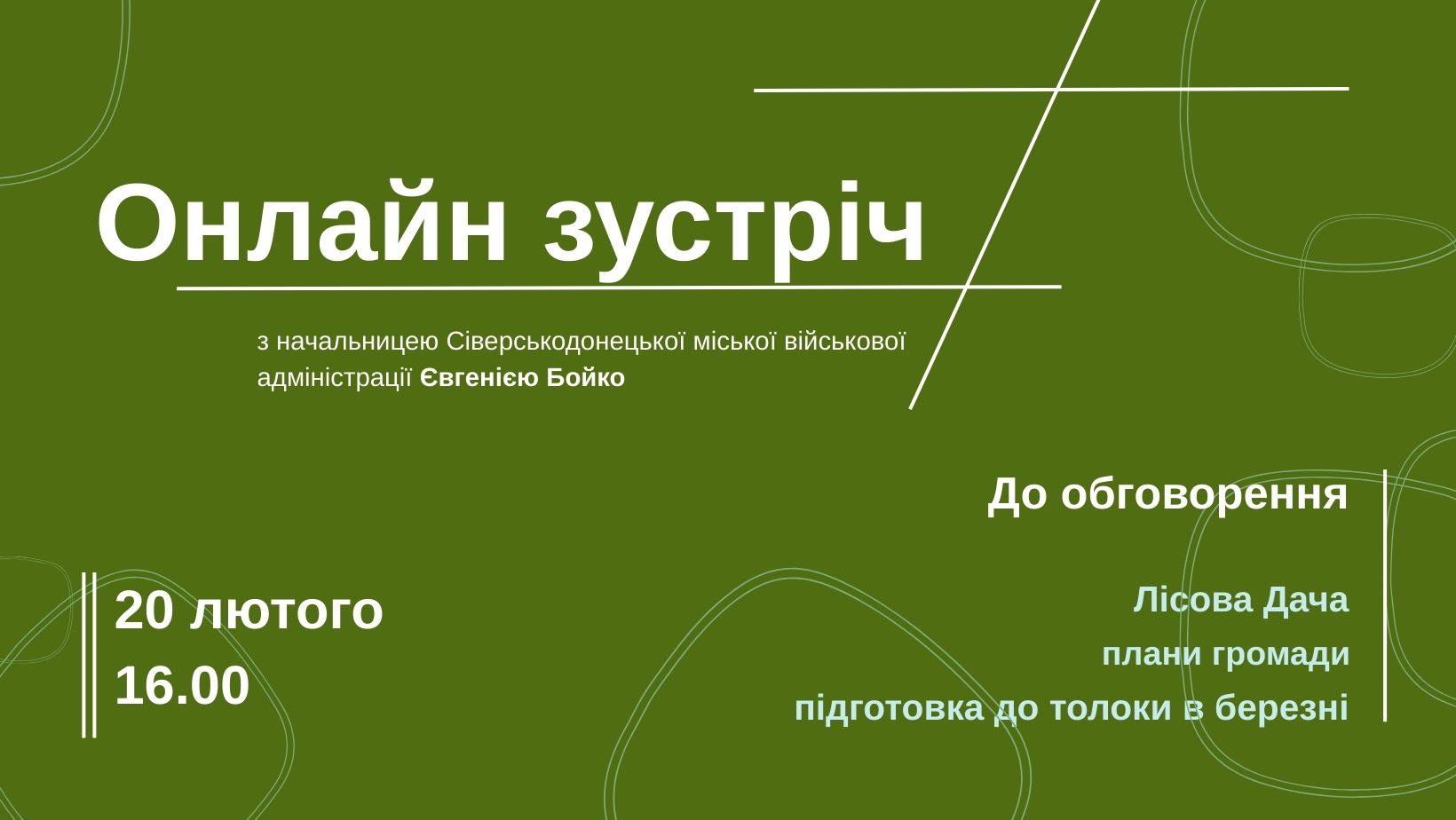 20 лютого о 16:00, відбудеться онлайн-зустріч з начальницею Сіверськодонецької міської військової адміністрації Євгенією Бойко.