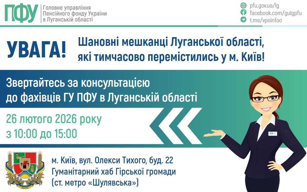 26 лютого поточного року відбудеться прийом внутрішньо переміщених осіб з Луганської області, які тимчасово мешкають у Києві, фахівцями ГУ Пенсійного фонду України в Луганській області.