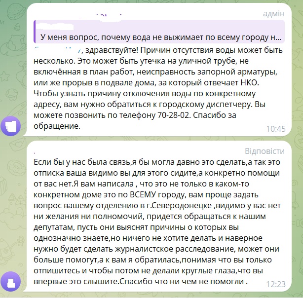 «Верхні поверхи зовсім без води»: у мережі обурилися «відписками» окупантів на проблему у Сіверськодонецьку