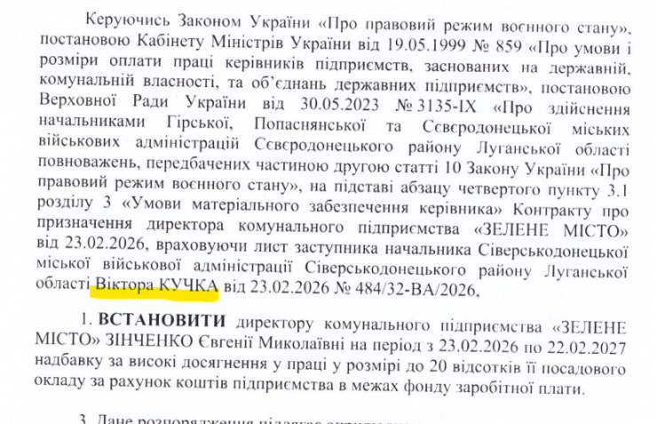 У тексті документа йдеться, що рішення ухвалене, зокрема, «враховуючи лист заступника начальника Сіверськодонецької міської військової адміністрації... Віктора Кучка».