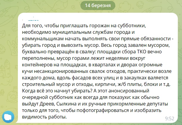 «Коли все це почнуть прибирати? А цей черговий анонсований суботник, як завжди, для показухи: як завжди вийдуть Дрєєв, Силкіна та їхні ручні, підгодовані депутати лише для того, щоб сфотографуватися та створити видимість роботи», – зазначив автор коментаря.