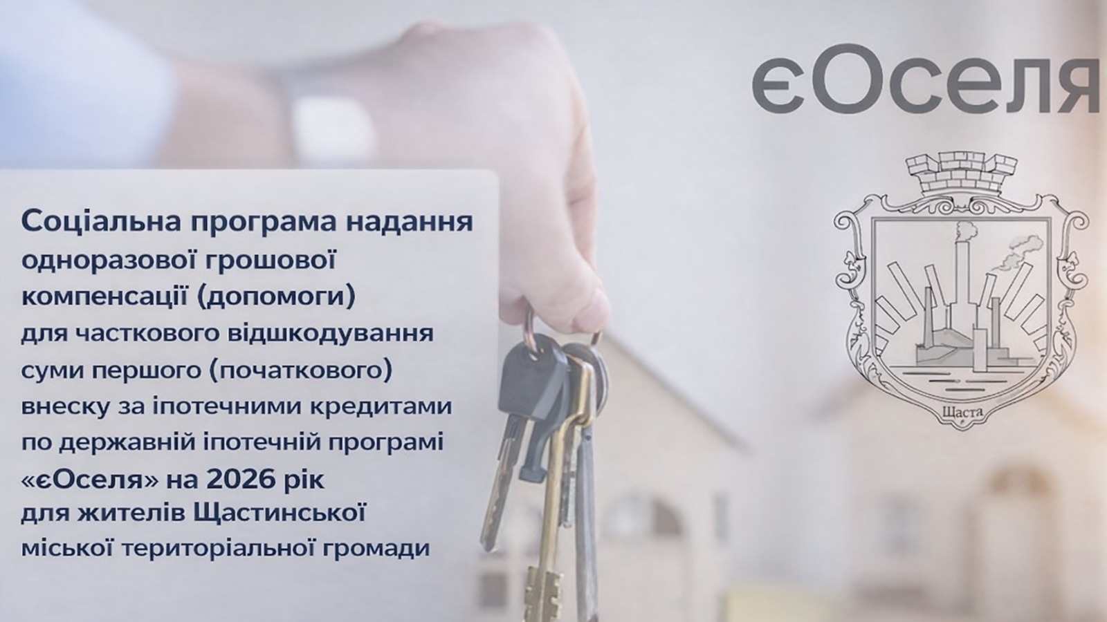 У 2026 році для жителів Щастинської міської громади Луганської області діятиме Соціальна програма надання одноразової грошової компенсації, яка передбачає часткове відшкодування першого (початкового) внеску за іпотечними кредитами у межах державної програми «єОселя».