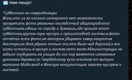 Там опублікували звернення місцевих жителів, у якому люди пишуть, що через поганий інтернет не мають можливості додати фото реальних наслідків цього суботника.