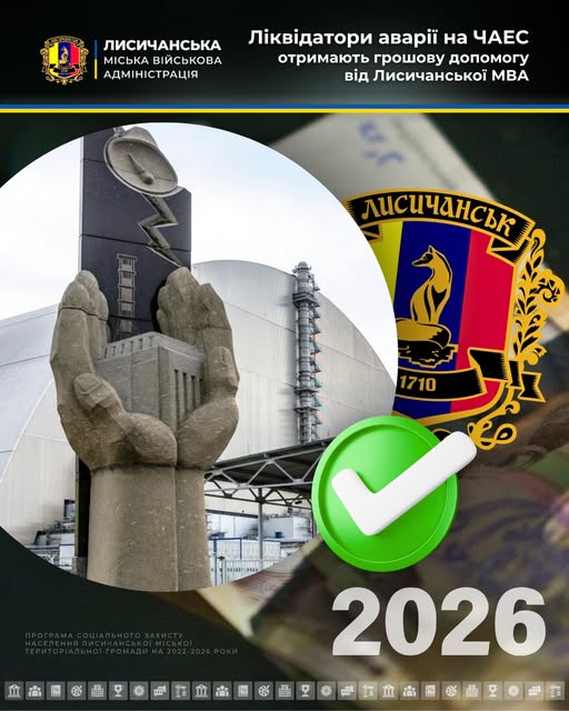 560 тисяч гривень одноразової грошової допомоги виплатять ліквідаторам наслідків аварії на ЧАЕС з Лисичанської громади.