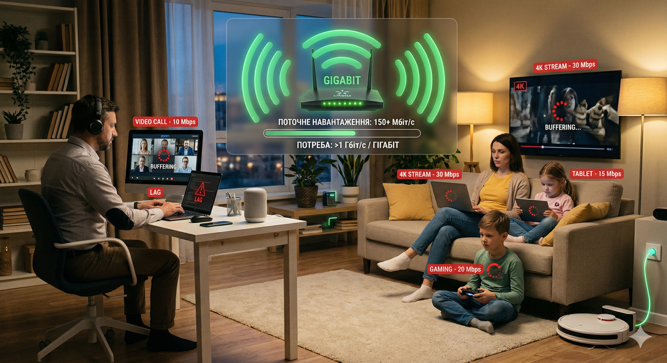 Варто додати запас у 20–30 відсотків понад розрахункову цифру, адже трафік розподіляється між усіма гаджетами одночасно. Простий приклад: родина з чотирьох осіб, де одночасно йде відеодзвінок, стрім серіалу в 4K і онлайн-урок, потребуватиме щонайменше 80–100 Мбіт/с для безперебійної роботи всіх пристроїв.