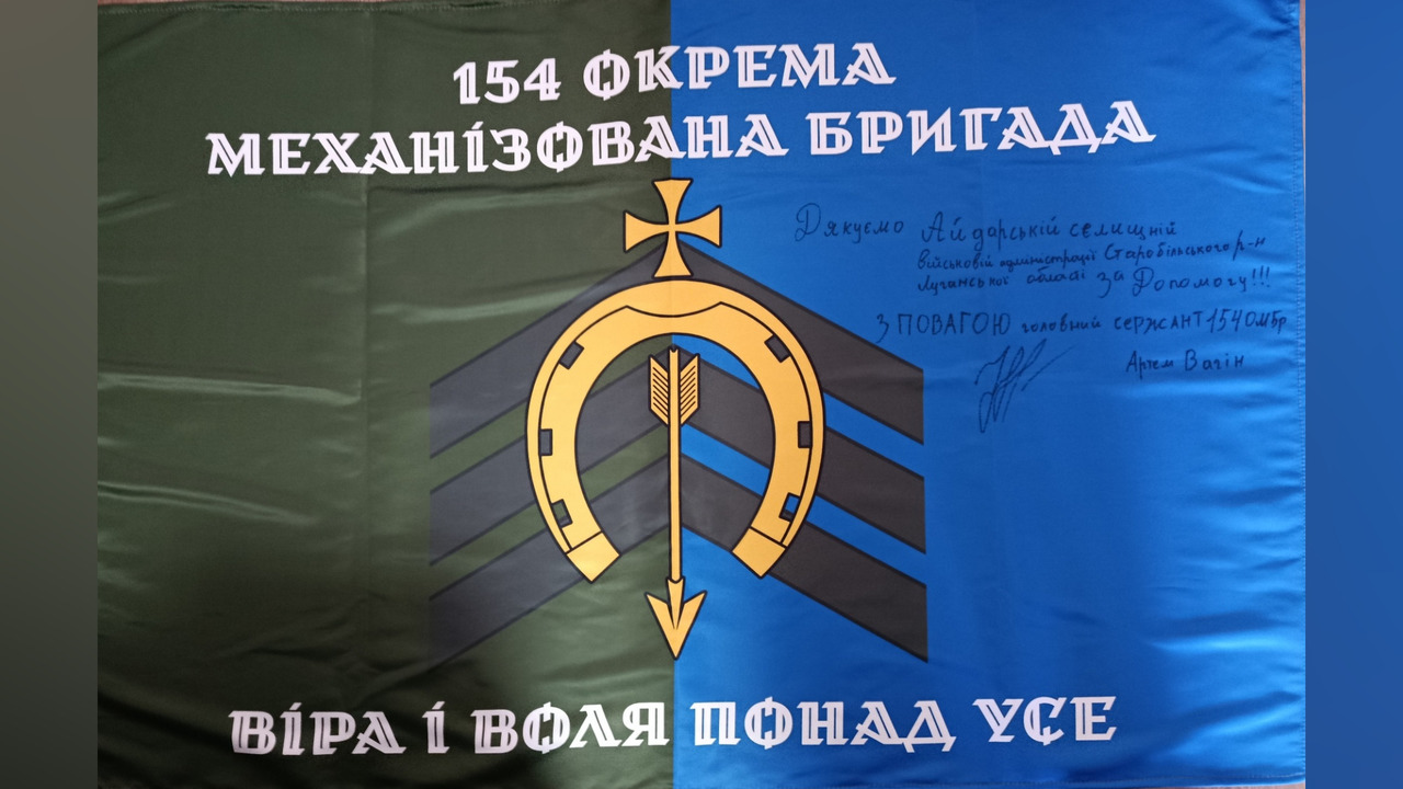 Воїни 154-ї окремої механізованої бригади передали Айдарській громаді підписаний прапор та подяку.