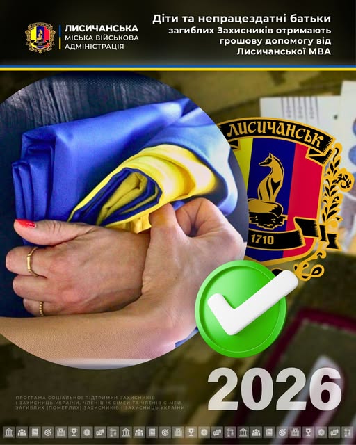 В адміністрації нагадали, що допомогу надають непрацездатним батькам, дружині (чоловіку) загиблого (померлого) захисника/захисниці, за умови зареєстрованого місця проживання (на дату звернення) в Лисичанській громаді.