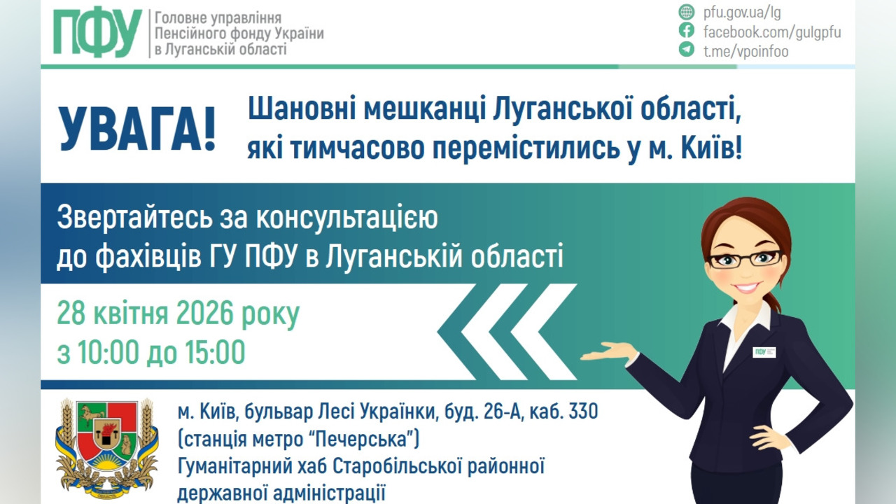 28 квітня у Києві відбудеться прийом внутрішньо переміщених осіб спеціалістом ГУ ПФУ у Луганській області.