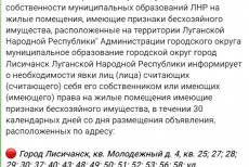 У мережі з’явився список квартир, які вскриватимуть в одному з районів окупованого Лисичанська. Про це...