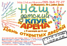 Наш детский клуб "Арена" приглашает родителей деток с 9 месяцев до 8 лет на Дни открытых дверей по субботам и воскресеньям 1, 2, 15 и 16 октября с 10.00 до 12.00 по адресу: г.Северодонецк, ул.Федоренко, 20-а (район Джаза, квартал Детской поликлиники, напротив СШ №15). Тел. 099-364-72-27, сайт http://sd.ua/dkarena.