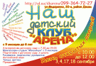 "Наш детский клуб "Арена" приглашает родителей и деток с 9 месяцев до 8 лет на бесплатные ПРАЗДНИКИ Дней открытых дверей! Ждем Вас по адресу: г.Северодонецк, ул.Федоренко, 20-а по субботам и воскресеньям 3, 4, 17 и 18 сентября с 10.00 до 12.00. Тел. 099-364-72-27, сайт http://sd.ua/dkarena